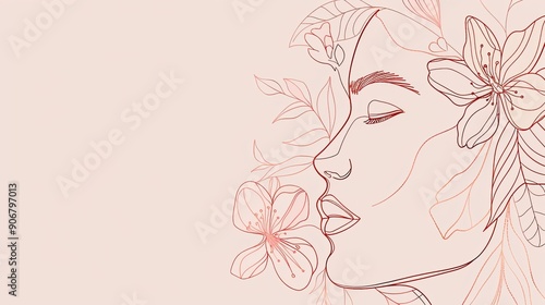 Women face in one line art style with flowers and leaves.Continuous line art in elegant style for prints, tattoos, posters, textile, cards etc. Beautiful woman face Vector illustration