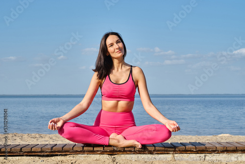 Women in sportswear sitting in a lotus position and meditating during yoga classes on the seashore. Practicing yoga lesson, breathing, meditation, doing Ardha Padmasana exercises. Wellness concept