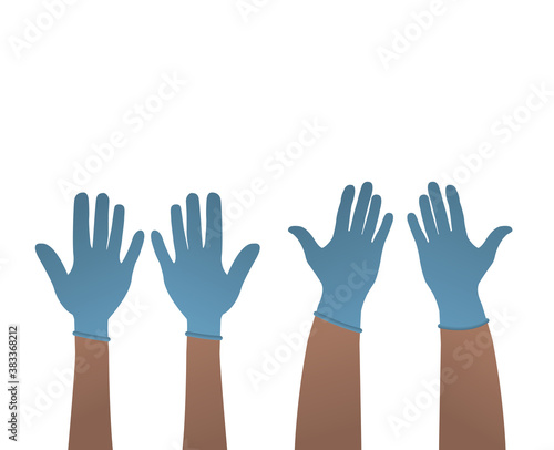 Women's and men's hands wear protective blue gloves. Latex gloves as a symbol of protection against viruses and bacteria. Precautionary icon. Vector illustration isolated on a white background.