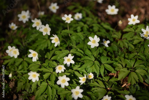 Wood anemone white flowers in spring garden, wild spring flowers background..