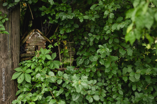 Wood birdhouse surrounded by green lush tree branches with leaves