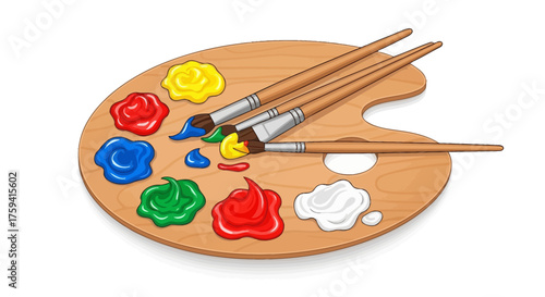 Wooden art palette with colorful paints and paintbrushes for artistic creation