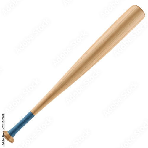 Wooden baseball bat with a blue grip, a sports equipment for playing baseball