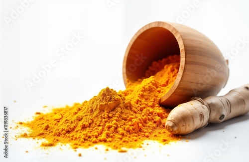 Wooden bowl spills turmeric powder onto white background. Turmeric spice ingredient spilled from bowl. Healthy seasoning for cooking. Indian culinary herb. Aromatic ground spice. Natural organic