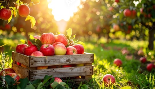 Wooden crate filled with ripe red apples in an orchard at sunset