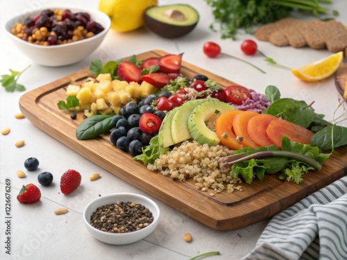 Wooden cutting board with organic food and creative plating arrangement for culinary presentation