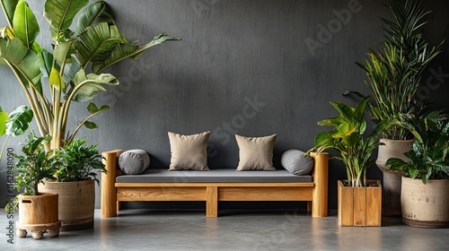 Wooden daybed with pillows sits amidst potted plants against a dark grey wall.