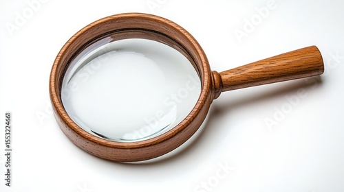 wooden handled magnifying glass with large round clear lens on white background symbolizing focus and discovery
