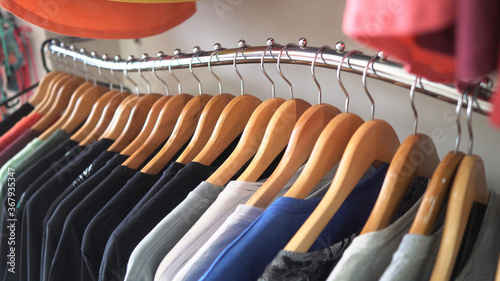 Wooden hangers wearing girl's clothes in a store.