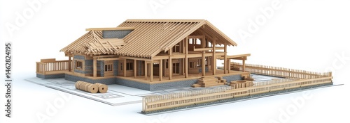Wooden house under construction on blueprints