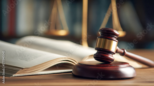 Wooden judge's gavel resting on sound block with legal book and brass scales of justice blurred in background on a wooden desk surface
