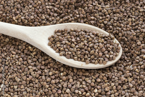 Wooden spoon with raw buckwheat groats