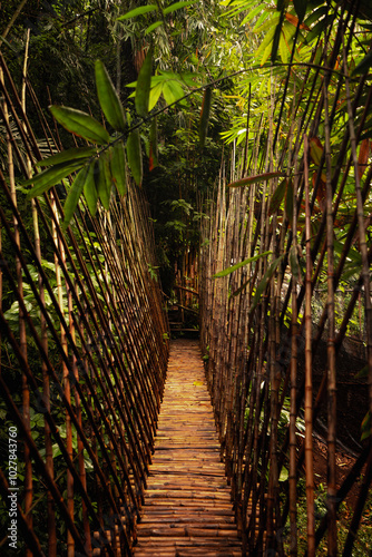 Wooden suspension bridge in Ubud, Bali, Indonesia, surrounded by lush nature, offering a peaceful and scenic escape.