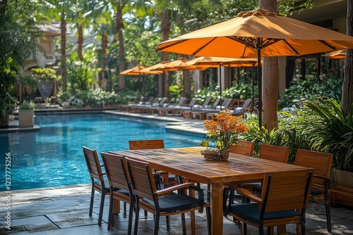 Wooden table and chairs with orange accents by the pool at a sunny outdoor resort hotel, vibrant colors and relaxing atmosphere.