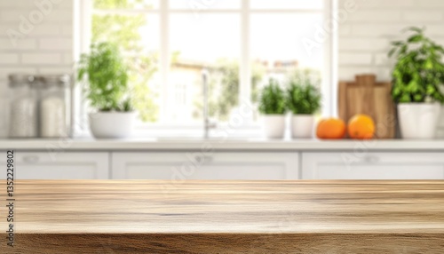 Wooden Table Top in Kitchen with Blurred Background and Natural Light