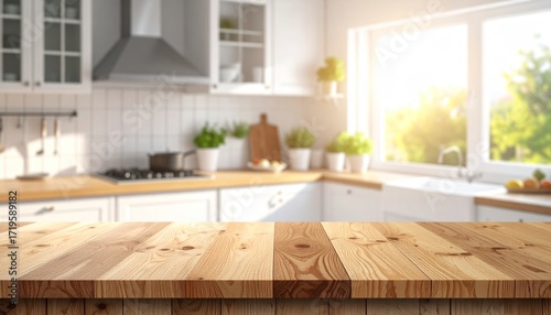 Wooden Table Top in Sunny White Kitchen Interior Background