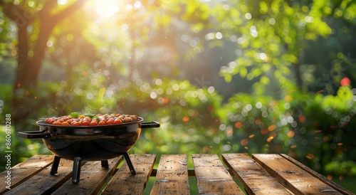 Wooden Tabletop With Oval Serving Tray in a Green Garden During a Sunny Afternoon