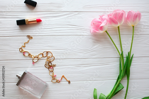Wooden white background,perfume, jewelry, gifts and tulips. Conception holiday, March 8, Mother's Day.