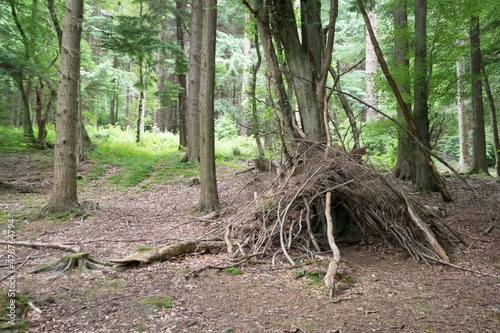 Woodland hide made of sticks and branches in teepee shape in a clearing.
