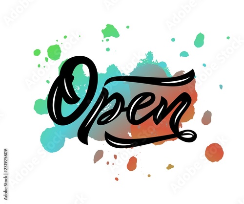 Word Open modern calligraphy lettering on watercolor splash. Isolated. Black color