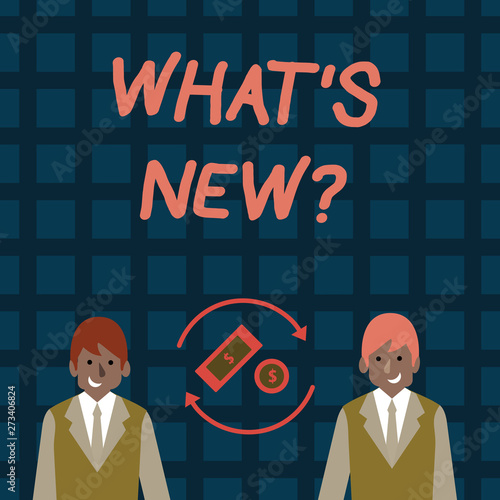 Word writing text What S New Question. Business photo showcasing when you ask someone about his current live events actions Money in Dollar Currency Sign Inside Rotating Arrows Between Two Businessmen