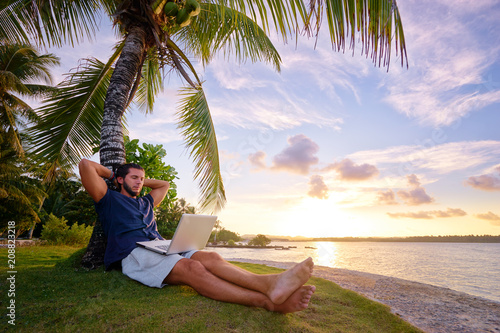 Work and vacation. Young man working on laptop computer on the tropical beach under the palm tree.
