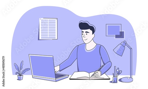 Work in the office. Accounting. Business. Practice. Study. Character in fancy color at computer desk. Can be used for work at home, freelancing, courses, web page design, advertising. Vector.