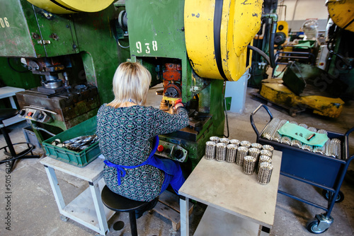Worker operates metal press stamping machine. Production of press forms for cookies