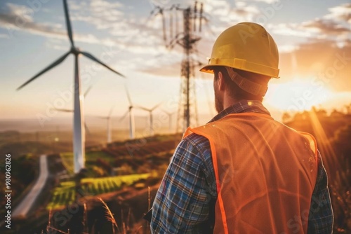 Worker Overseeing Wind Turbines at Sunset