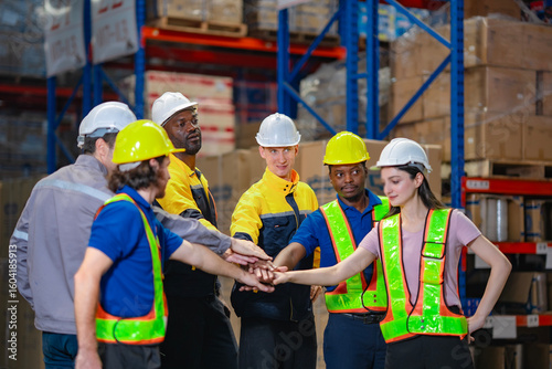 Workers in uniforms gather to form a team huddle in the warehouse. The gesture signifies shared vision, teamwork spirit, and effective coordination in a large-scale logistics operation.