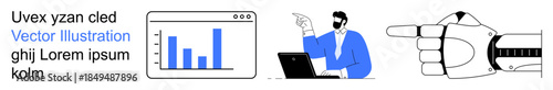 Workflow management, data analytics, business meetings, teamwork, user interaction, and communication. Bar chart, person at a desk pointing and hand pointing concept. Data analytics and teamwork
