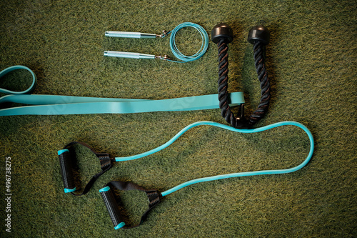 Workout equipment like triceps rope and various resistance bands on turf gym floor
