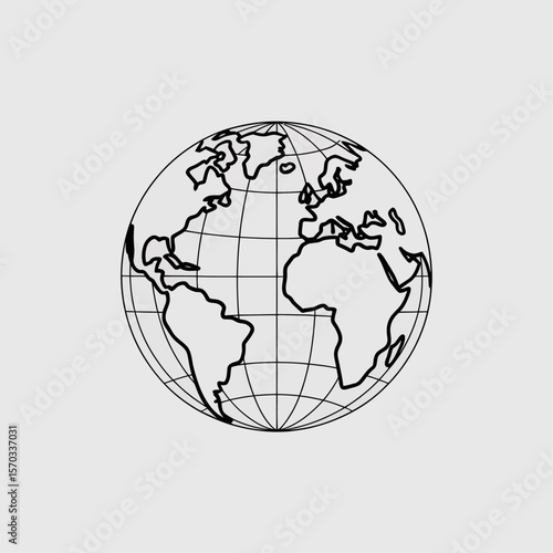 World Globe Icon: A minimalistic grayscale illustration of a globe, featuring the continents and a grid, representing global interconnectedness and the world.