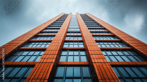 Worm's eye view of a tall building with orange brick facade and many windows against a cloudy sky