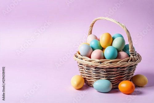 Woven basket filled with colorful Easter eggs, placed on a purple surface.