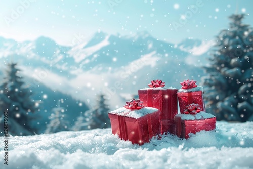 Wrapped Red Christmas gifts, golden ribbons, bow against a light blue winter snowy decorated trees. Snow particles dust, Xmas lights bokeh. Festive wide banner template with space for text, montage