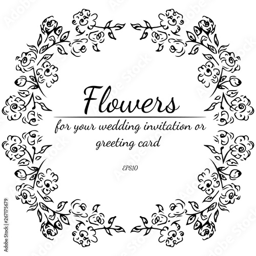 Wreath of roses or peonies flowers and branches isolated on white background. Foral frame design elements for invitations, greeting cards, posters. Hand drawn vector illustration. Line art. Sketch