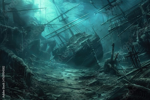 Wreck of a sunken ship in the depths of the sea. Generative AI