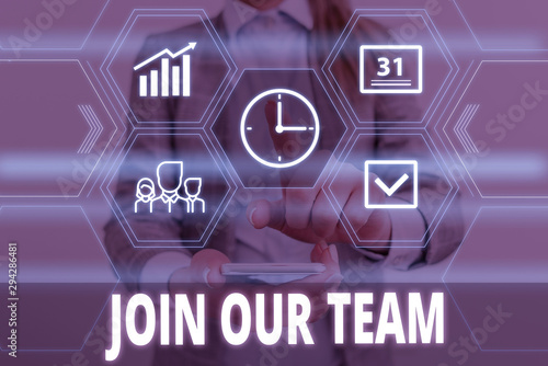 Writing note showing Join Our Team. Business concept for inviting someone to join in your local group or company Woman wear formal work suit presenting presentation using smart device
