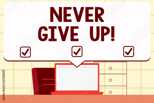 Writing note showingNever Give Up. Business photo showcasing Keep trying until you succeed follow your dreams goals