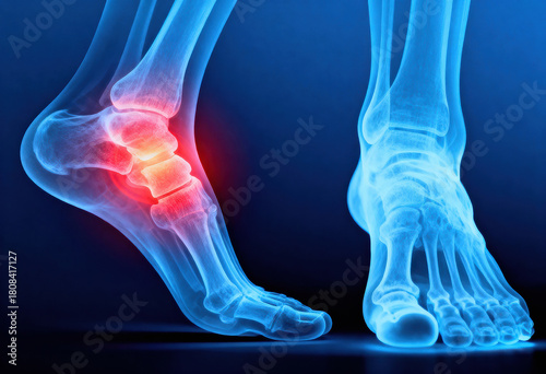 X-ray view of human feet with highlighted red pain in midfoot, depicting injury or medical condition