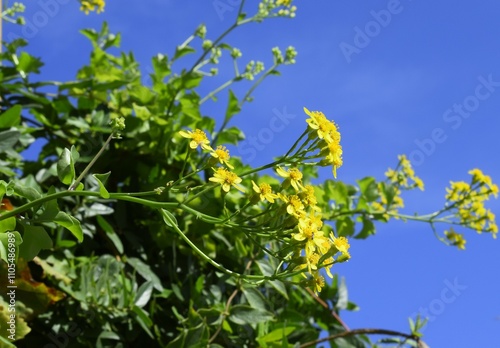 yellow flowers on blue sky background. Crete