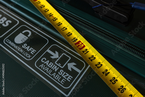 Yellow measuring tape placed on a suitcase, checking the correct size of luggage during airport check-in