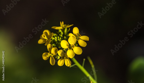 Yellow mustard flower field close-up on the background of greenery in the garden in summer