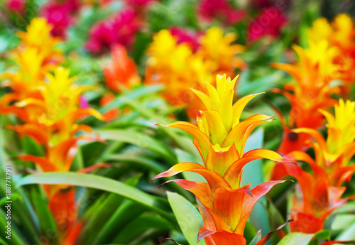 Yellow Orange bromeliad rosette shape flowers blossom in springtime