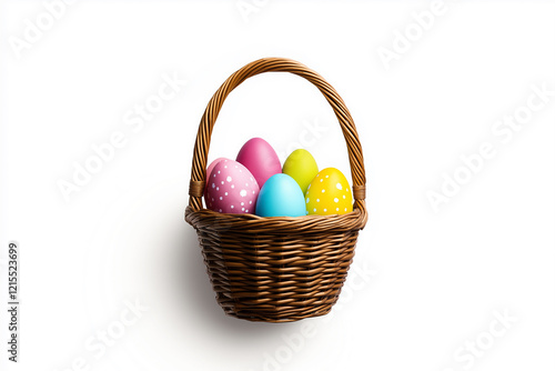Yellow, pink and blue painted Eggs in basket isolated on white background. Easter concept