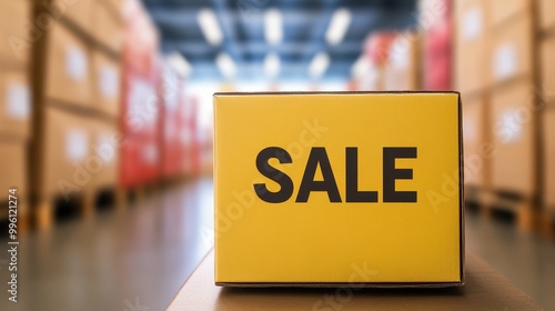 Yellow sale box in a warehouse with blurred storage background.