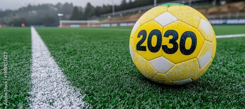 Yellow Soccer Ball With 2030 Text on Green Field, Concept for Future Football Tournament