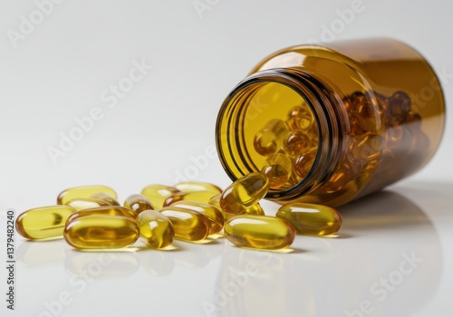 Yellow softgel capsules spilling from amber glass bottle on clean white background