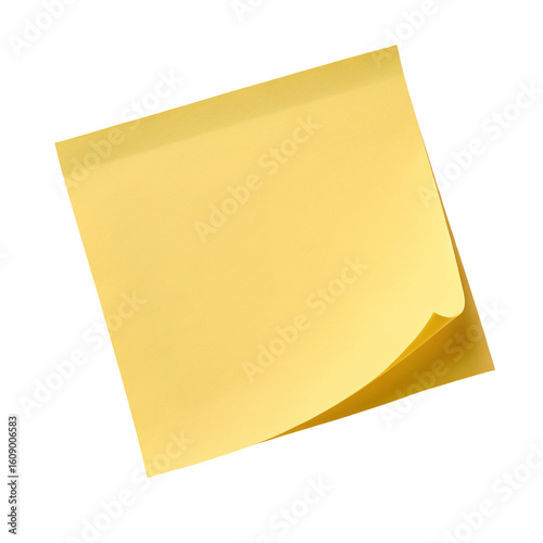 Yellow sticky note isolated on white background with curled corner and empty space for writing